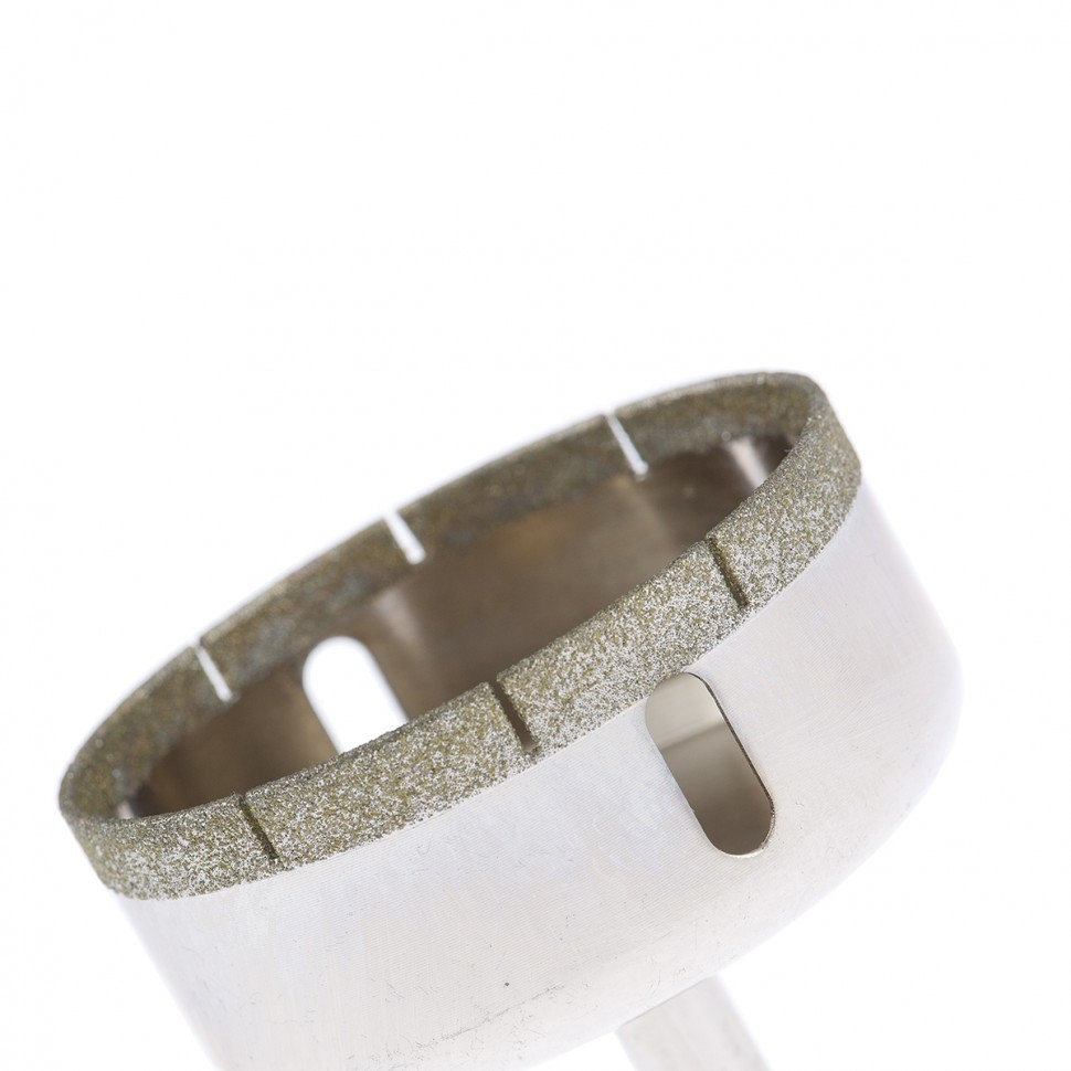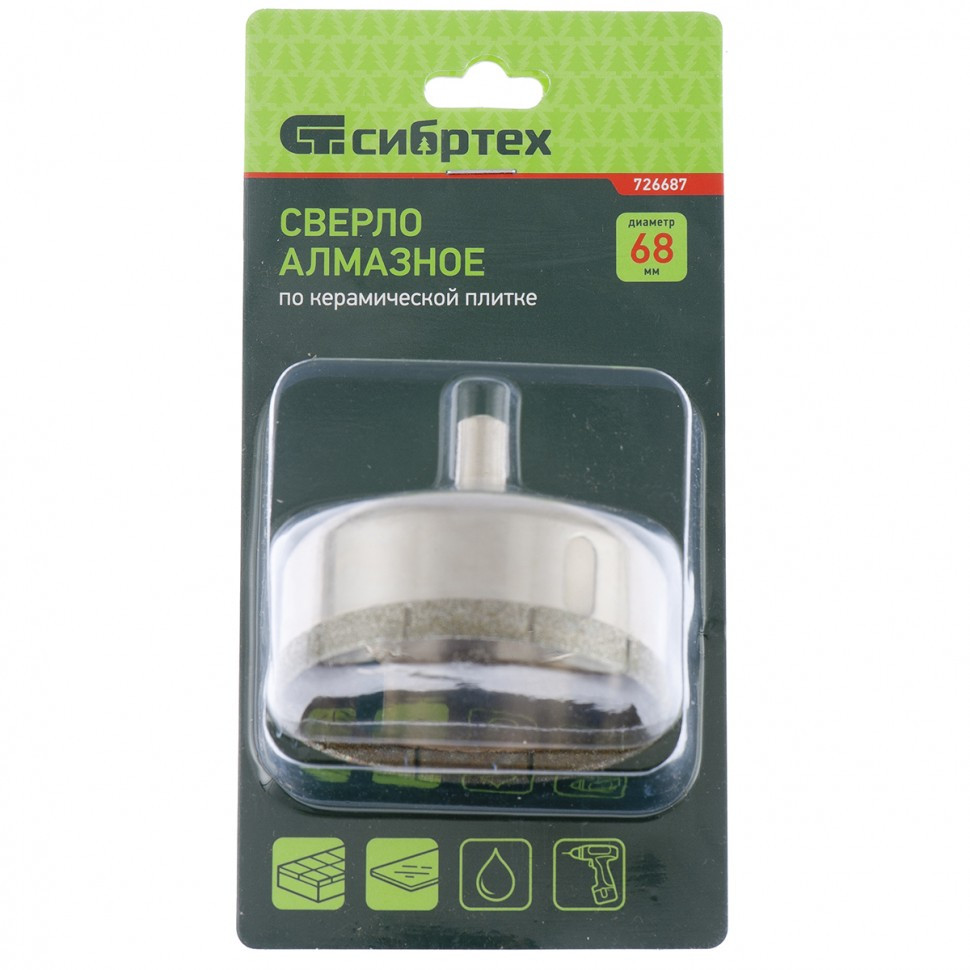 Сверло Сибртех 726687 размером 68 х 55 мм, с цилиндрическим хвостовиком, используется для получения ровных отверстий без сколов в стекле и керамической плитке. Устанавливается в патрон дрели или шуруповерта, работающих в диапазоне 350-700 об/мин. Во время работы рекомендуется применять водяное охлаждение — это существенно увеличит ресурс оснастки. Использование кондуктора (арт. 72830) позволяет точно позиционировать сверло и облегчает засверливание. Оснастка подходит для выполнения работ небольшого объема и рекомендована для использования в быту.