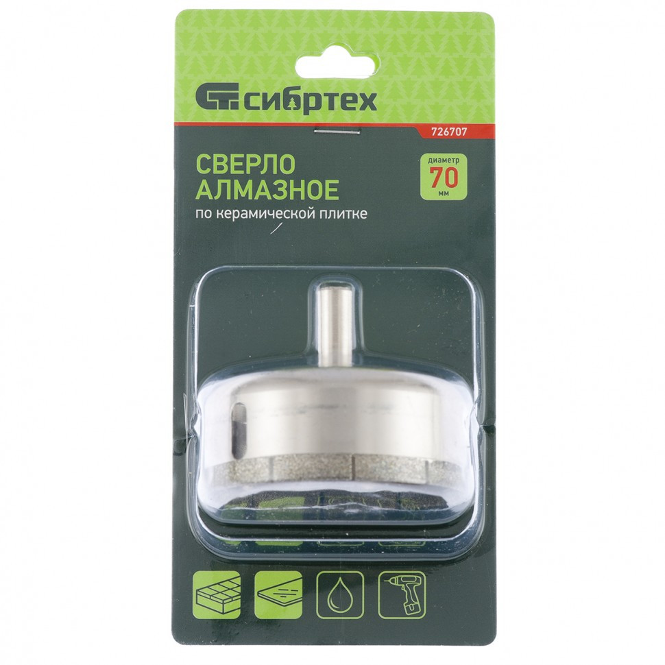 Сверло Сибртех 726707 размером 70 х 55 мм, с цилиндрическим хвостовиком, используется для получения ровных отверстий без сколов в стекле и керамической плитке. Устанавливается в патрон дрели или шуруповерта, работающих в диапазоне 350-700 об/мин. Во время работы рекомендуется применять водяное охлаждение — это существенно увеличит ресурс оснастки. Использование кондуктора (арт. 72830) позволяет точно позиционировать сверло и облегчает засверливание. Оснастка подходит для выполнения работ небольшого объема и рекомендована для использования в быту.