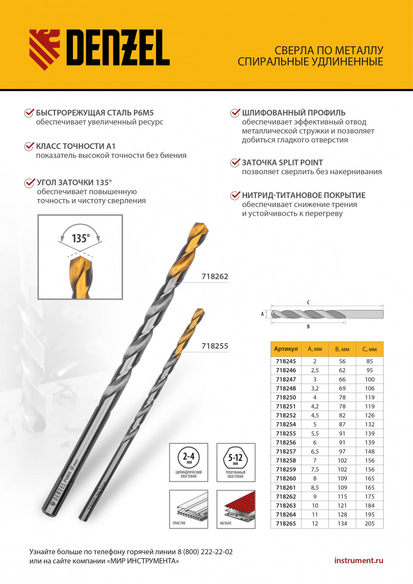 Удлиненное спиральное сверло по металлу Denzel Golden Tip 718260 из стали P6M5, размером 8 х 165 мм, предназначено для получения отверстий в легированных и цветных металлах — меди, алюминии, мягкой бронзе, титане, латуни. Оснастка позволяет эффективно справляться с этими задачами благодаря оптимальному углу заточки 135°. Класс точности A гарантирует высокое качество работ, а удлиненный профиль позволяет сверлить глубокие отверстия. Сверло используется для проведения монтажно-сборочных работ.