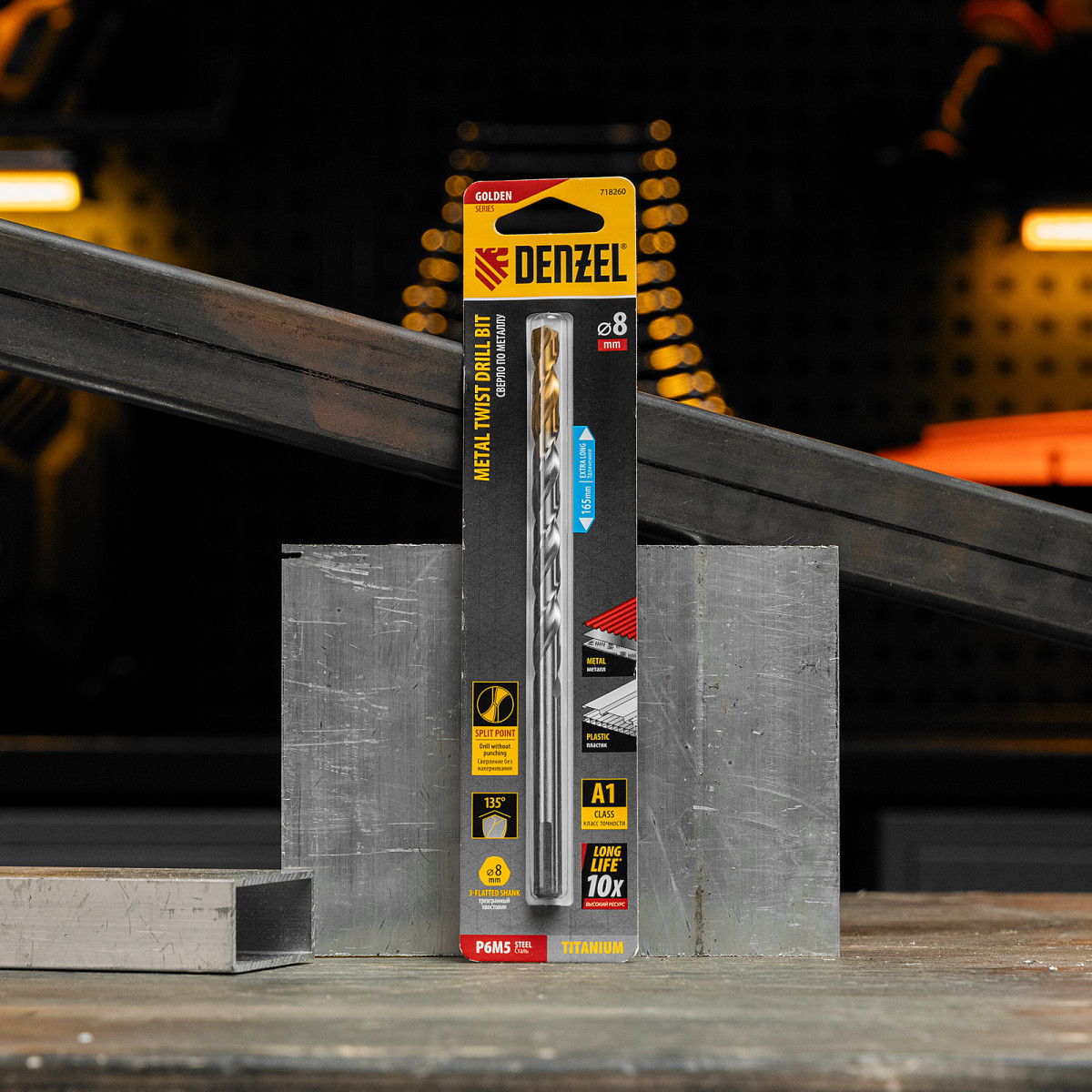 Сверло спиральное по металлу 8 х 165 мм, Р6М5, Golden Tip, удлиненное Denzel