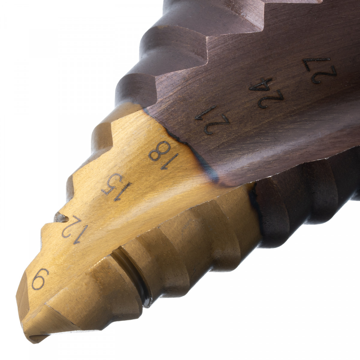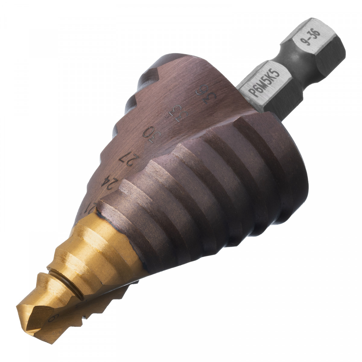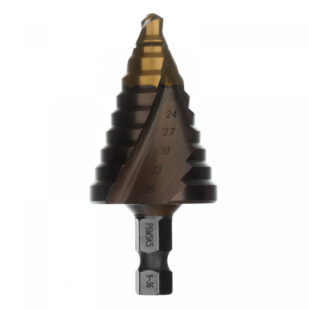 Сверло ступенчатое, 9-12-15-18-21-24-27-30-33-36 мм, Р6М5К5, 6-гр. хвостовик Denzel