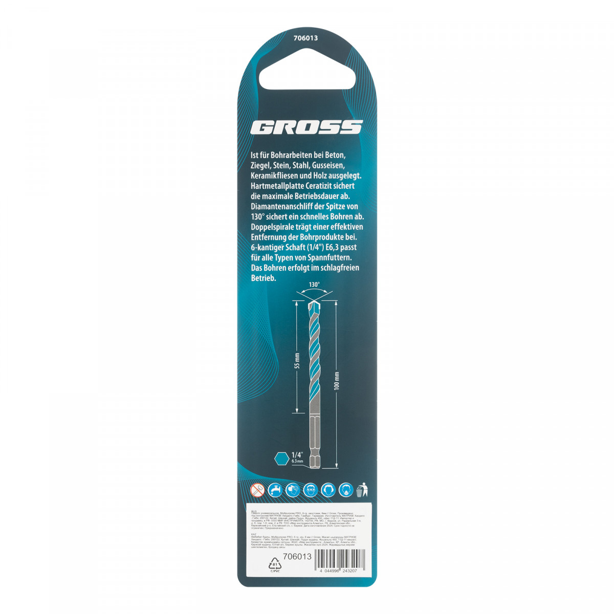 Сверло универсальное, Multipurpose PRO, 6-гр. хвостовик, 8мм Gross