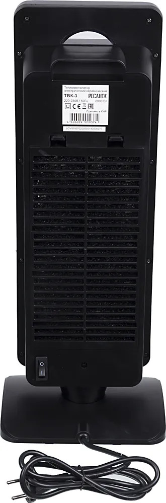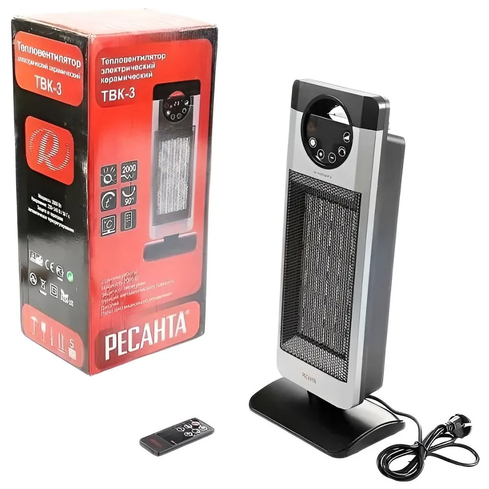 Тепловентилятор РЕСАНТА ТВК-3 – это бытовой отопительный прибор, который позволяет быстро нагреть воздух в помещении до необходимого значения. Высокая эффективность устройства обусловлена тем, что керамический нагревательный элемент мощностью 2000 Вт за короткий промежуток времени достигает рабочей температуры, а встроенный вентилятор обеспечивает равномерное распределение теплого воздуха. Прибор рассчитан на обогрев помещений площадью до 25 кв. м. Тепловентилятор данной модели имеет стильный и эргономичный дизайн. Он соответствует высоким требованиям пожарной безопасности, поскольку имеет датчик от опрокидывания и перегрева. Первый датчик автоматически выключает прибор при его падении, а второй – при достижении высокой температуры внутри. Подобное может произойти при засорении проходов для воздушных потоков пылью. Чтобы этого не допустить, необходимо регулярно чистить устройство, но использовать абразивные средства запрещено. Тепловентилятор оснащен дисплеем, таймером и функцией поворота. Для управления обогревателя РЕСАНТА ТВК-3 может использоваться пульт ДУ. К преимуществам можно отнести также компактные размеры и небольшой вес (2.2 кг).