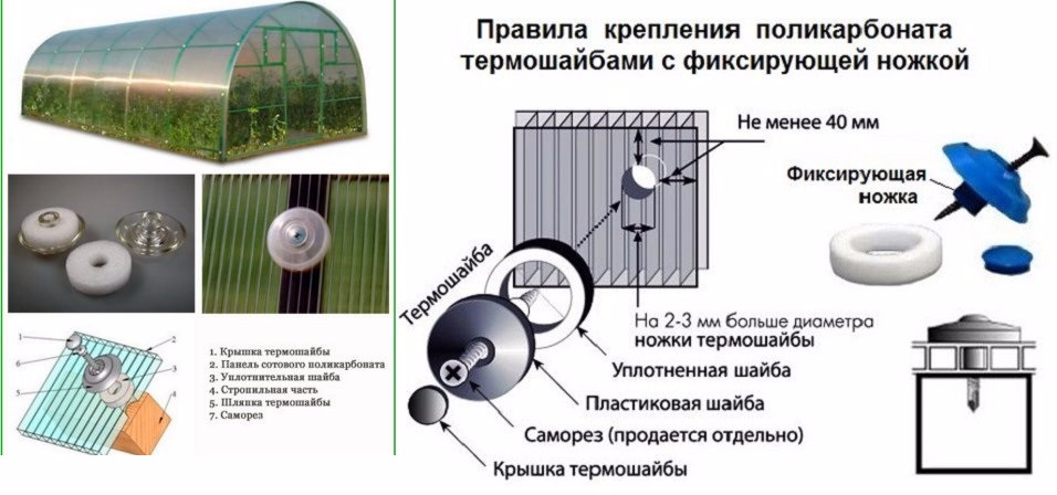 Термошайба — имеет монолитную форму с ножкой которая различается по высоте, в зависимости от используемого поликарбоната. Обеспечивает герметичное и надежное крепление поликарбонатных листов, устраняет «мостики холода», создающиеся саморезами, предотвращает смятие панели, и позволяющие осуществить крепление сотового поликарбоната к каркасу конструкции непосредственно сквозь панель. Достоинства: - Термошайбы эстетичны и очень просты в использовании. - Ликвидируют "мостики" холода, образующиеся при использовании саморезов с обычными шайбами. - Позволяют листам расширяться в условиях летней жары. - Обеспечивают надежное крепление листов при воздействии сильных ветров и даже в условиях ураганов и штормов. - Уплотнительная шайба делает крепление неуязвимым для воздействий внешней среды. - Специальная защелкивающаяся крышечка закрывает саморез.   Прочность и долговечность. - Термошайбы производятся из УФ-стабилизированного поликарбоната, что гарантирует их прочность и устойчивость к воздействию окружающей среды.