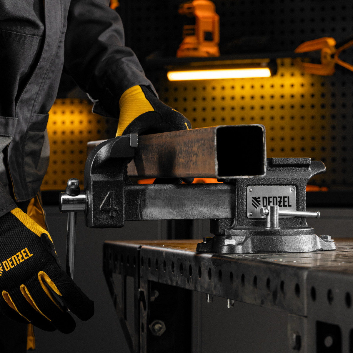 Слесарные поворотные тиски Denzel BVH-100 18683 с губками шириной 100 мм и стальной направляющей предназначены для фиксации деталей и заготовок, а также для выполнения мелких ударных работ — в конструкции предусмотрена наковальня. Рабочий ход составляет 100 мм, глубина зажима — 60 мм. Специальный зажим позволяет фиксировать трубы диаметром 15-35 мм, что расширяет возможности использования инструмента. На губки можно установить защитные накладки (приобретаются отдельно) для предотвращения повреждения зажимаемых предметов. Тиски поставляются с болтами для фиксации на рабочем столе и запасными штифтами-предохранителями. Пригодятся в мастерской и гараже.