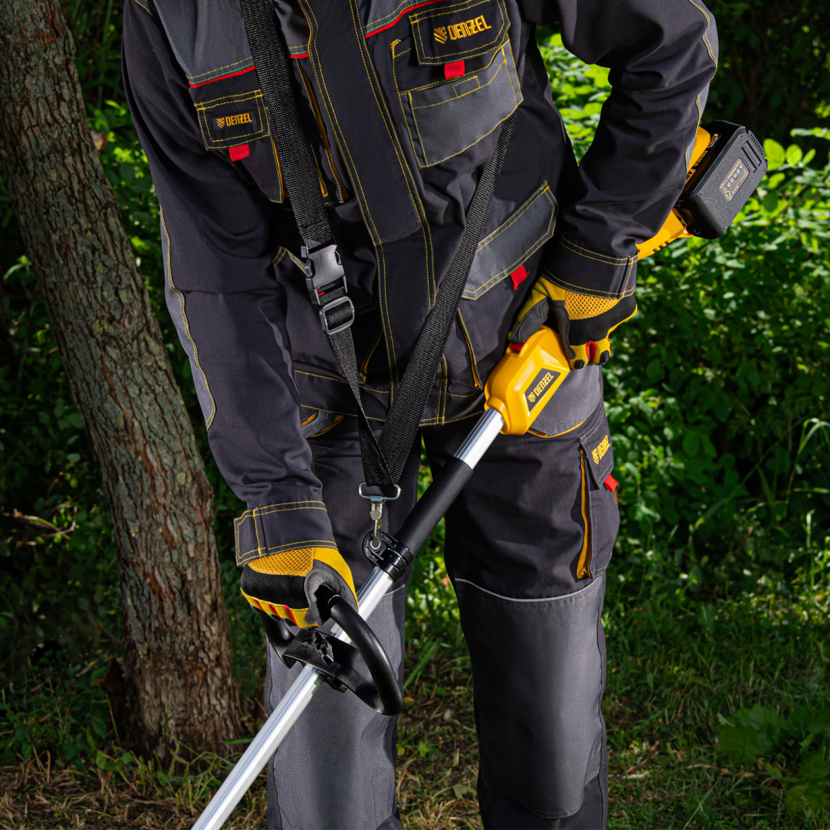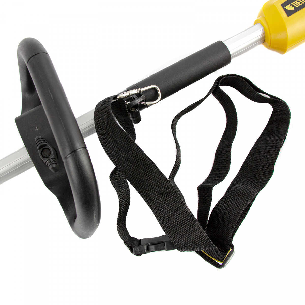- Равномерное распределение нагрузки — к триммеру прилагается плечевой ремень, позволяющий скашивать траву без ощущения усталости.