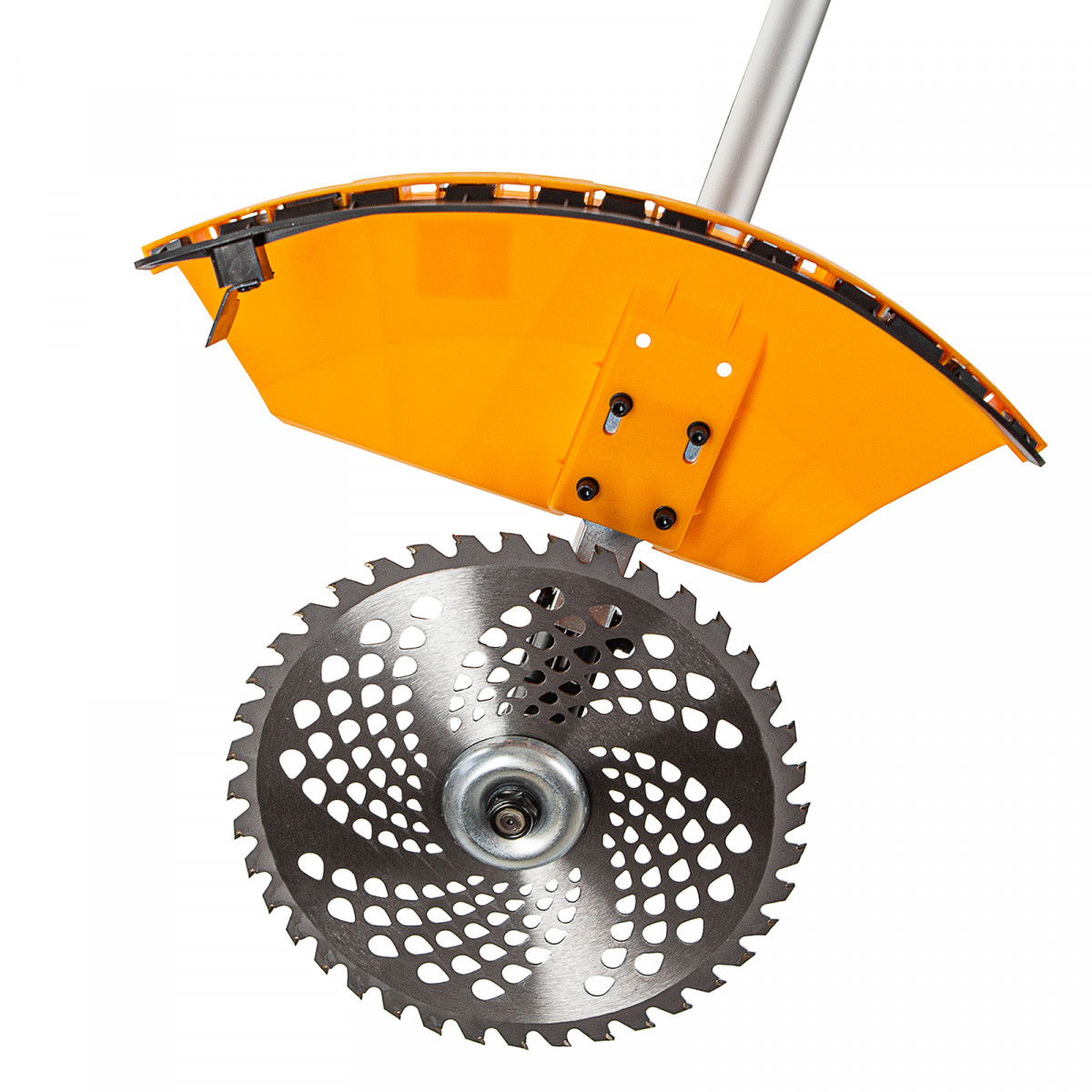 - Безопасная работа — пластиковый кожух защищает пользователя от вылетающей травы и мелких частиц.