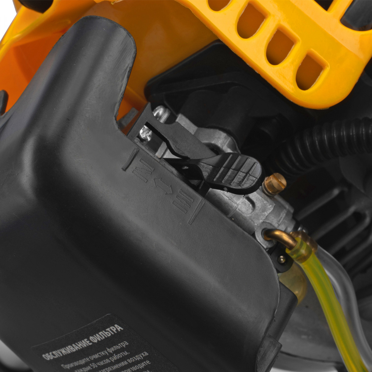 • Безопасность — блокиратор курка газа препятствует случайному запуску двигателя, прочный пластиковый кожух защищает пользователя от летящей травы, грязи и прочих твердых частиц.