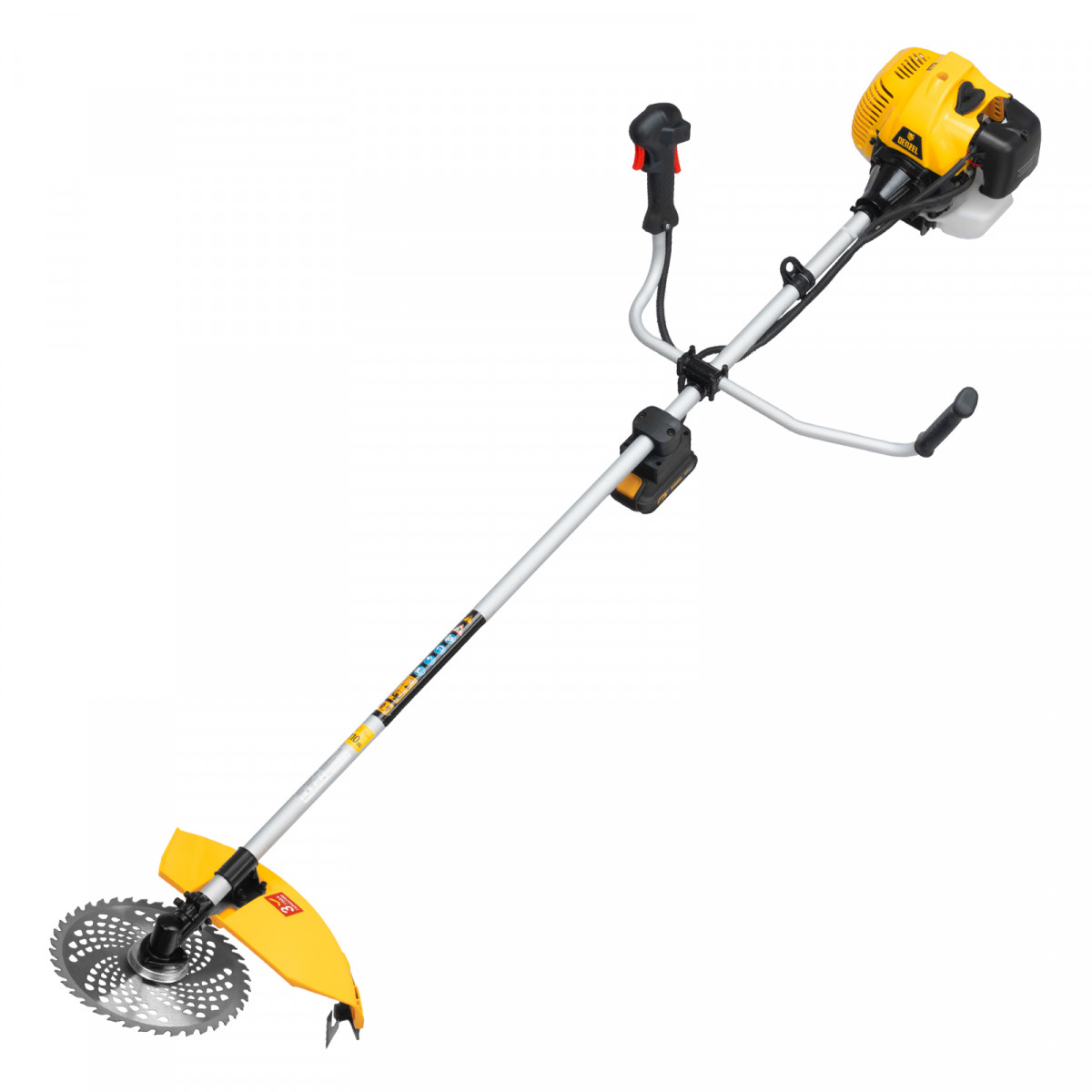 Бензиновый триммер Denzel DT-52E 962025 с двигателем объемом 52 куб. см, с неразъемной штангой и электростартером, поставляется комплектом из 2 частей и используется для ухода за дачным участком. С его помощью можно подравнять газон, скосить траву любого типа, в том числе с жесткими древовидными стеблями (полынь, крапива, лебеда, борщевик), а также срезать кустарник и молодые побеги деревьев с диаметром стволов до 10 мм. Триммер успешно справляется с этими задачами благодаря входящим в комплект катушке с леской и пильному диску с шириной скашивания 42 и 25,5 см соответственно. На штангу уже установлен редуктор и корпус сцепления, что упрощает подготовку инструмента к работе.