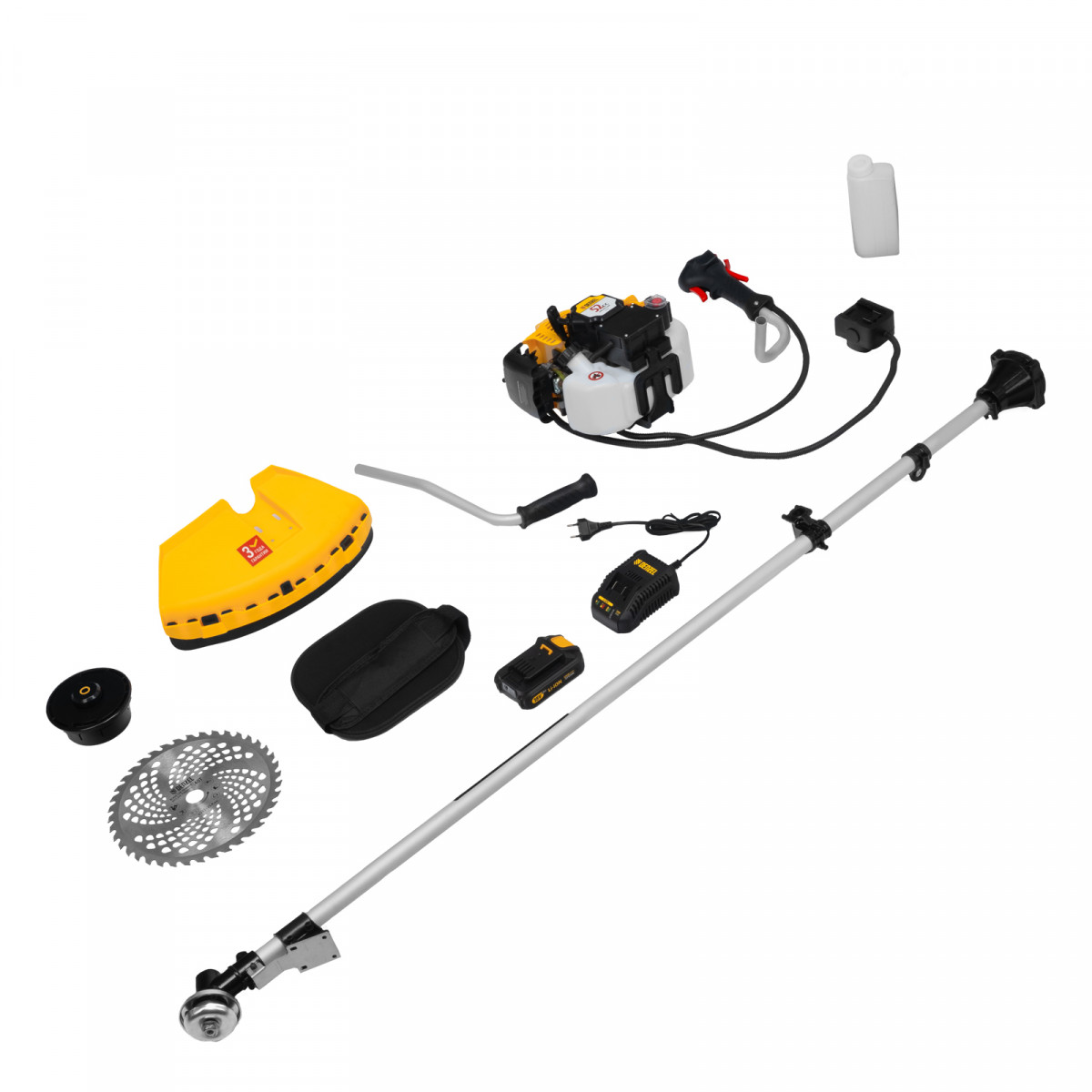 • Полный комплект поставки — аккумулятор, зарядное устройство и удобный дозатор для приготовления топливной смеси прилагаются к триммеру.