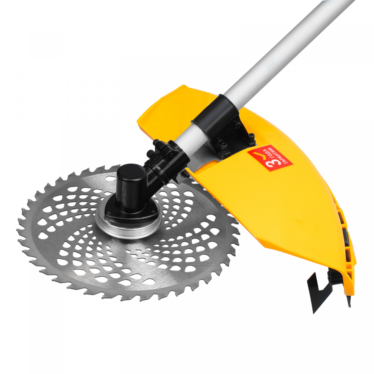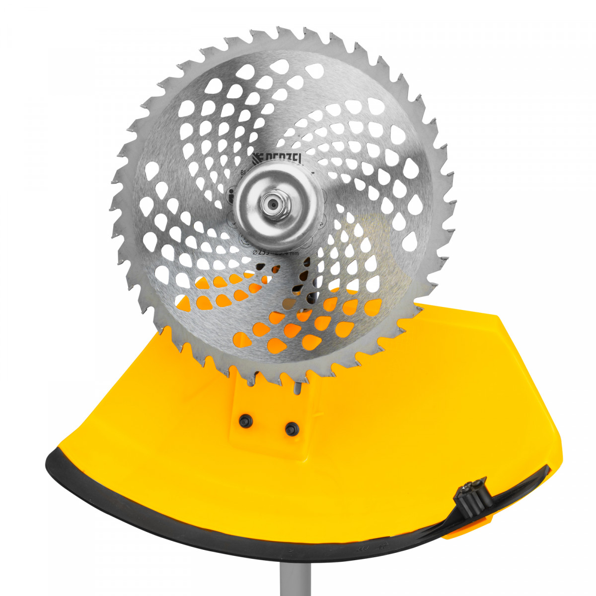 • Дополнительные возможности — можно приобрести и установить на триммер диски Denzel 96323, 96325 для быстрого удаления растительности с жесткими стеблями (полыни, крапивы, лебеды), 96328 для скашивания молодых побегов кустарника диаметром до 3 мм.