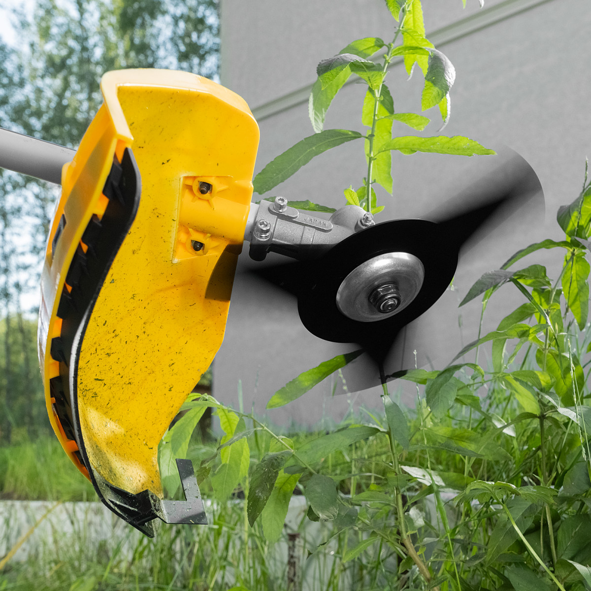 - Безопасность — блокировка выключателя препятствует случайному запуску, а защитный кожух предохраняет от летящей травы.