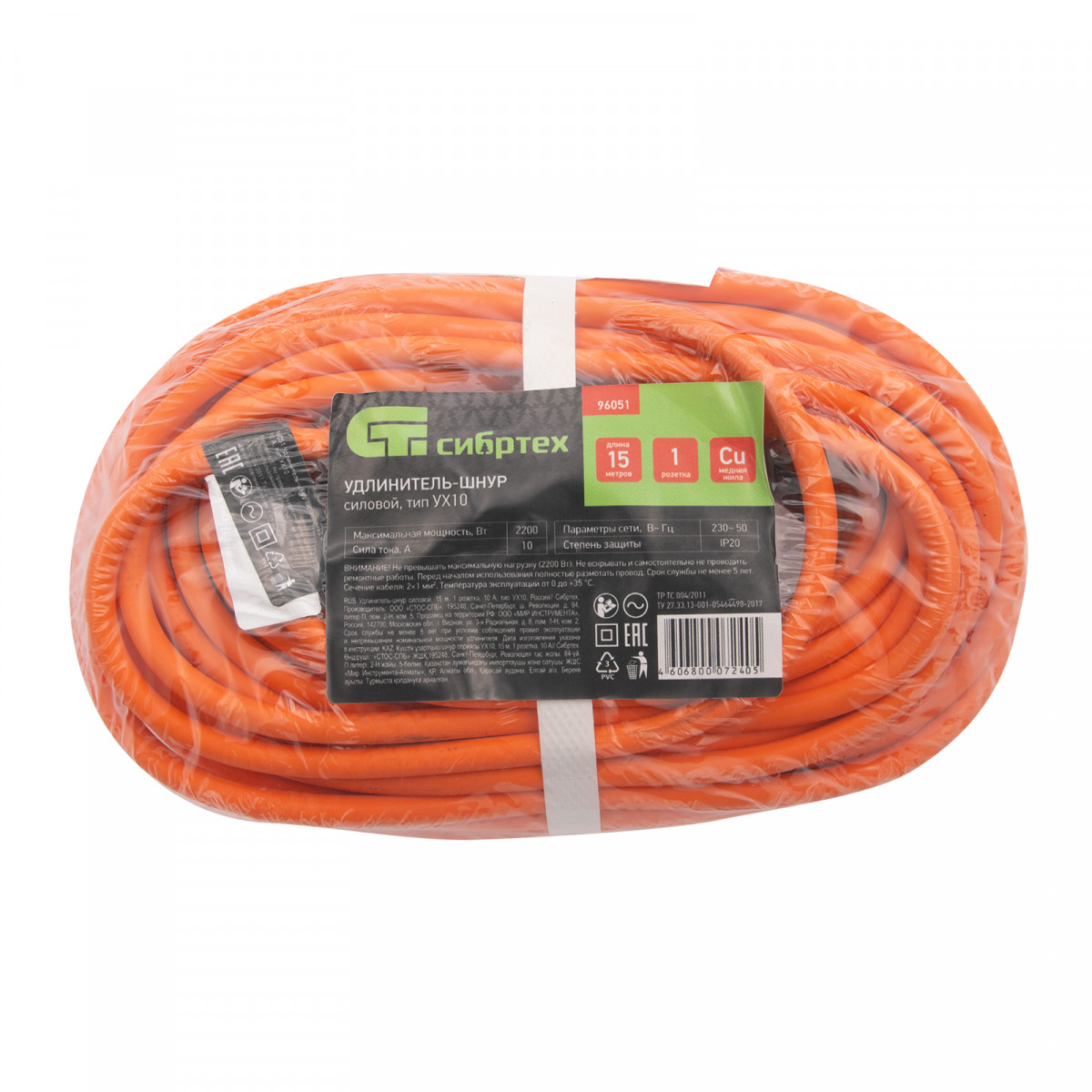 Удлинитель-шнур силовой 15 м, 10A, тип УХ10, 1 розетка, Сибртех