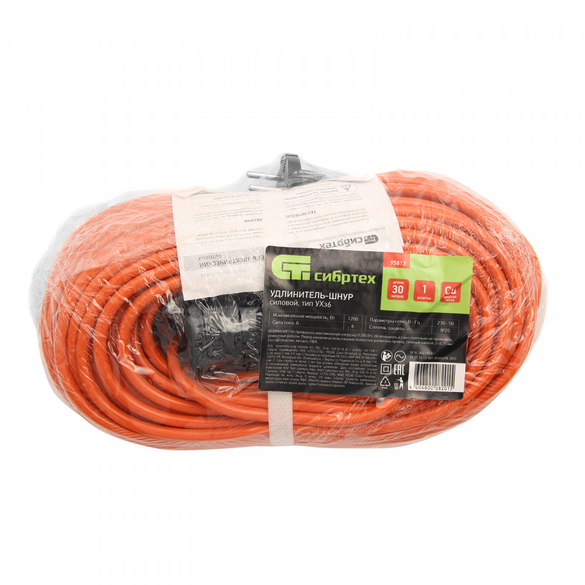 Силовой удлинитель-шнур Сибртех 95813, тип УХз6, имеет 1 розетку без заземления, рассчитан на силу тока 6 А и позволяет подключить к электросети прибор мощностью до 1200 В, находящийся на расстоянии до 30 м от стационарного источника питания. Пригодится во время выполнения строительных и ремонтных работ, будет полезен в гараже и на дачном участке.,Условия эксплуатации: от +1°С до + 35°С при относительной влажности не более 80%.