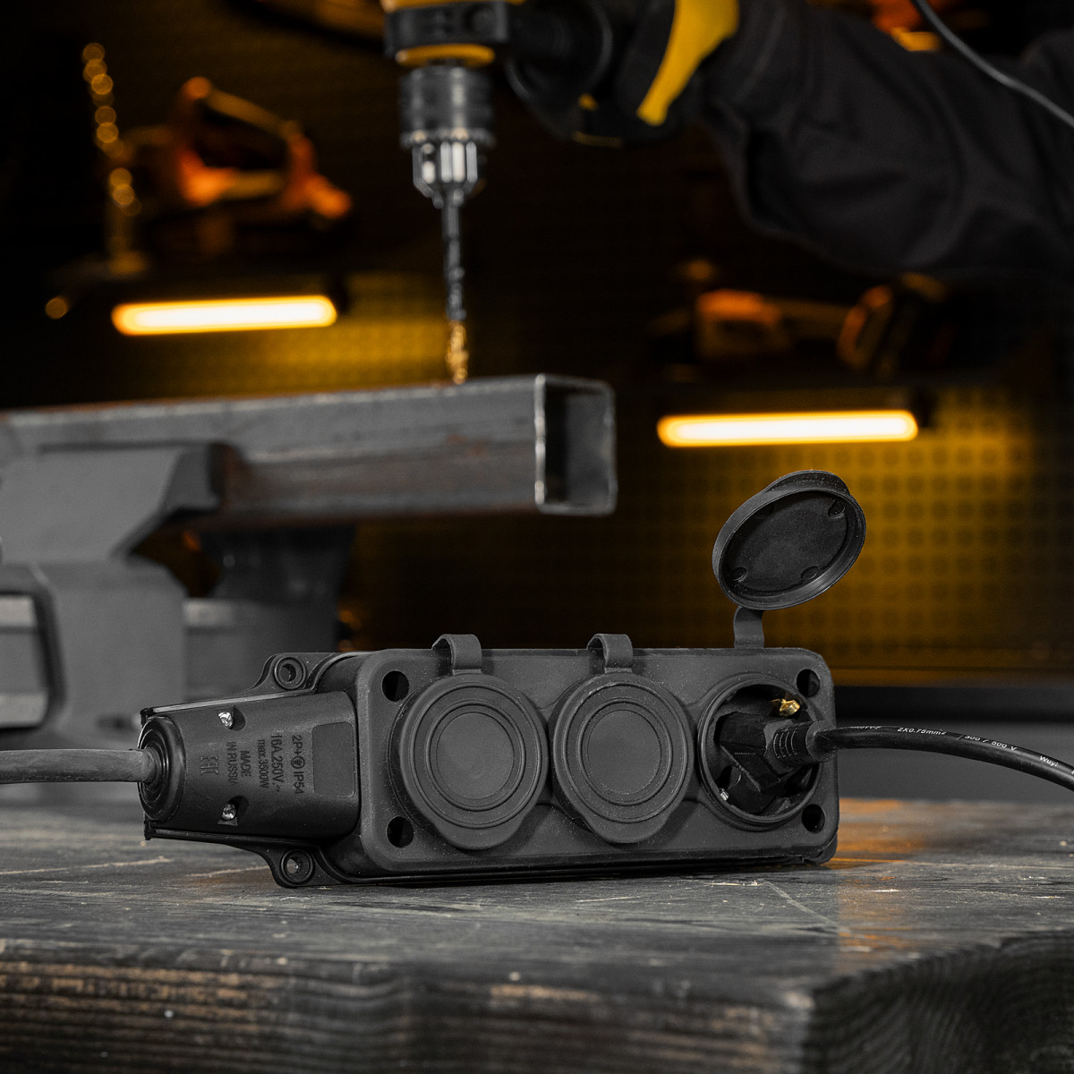 - Высокая степень защиты — удлинитель можно использовать даже во время выпадения осадков.