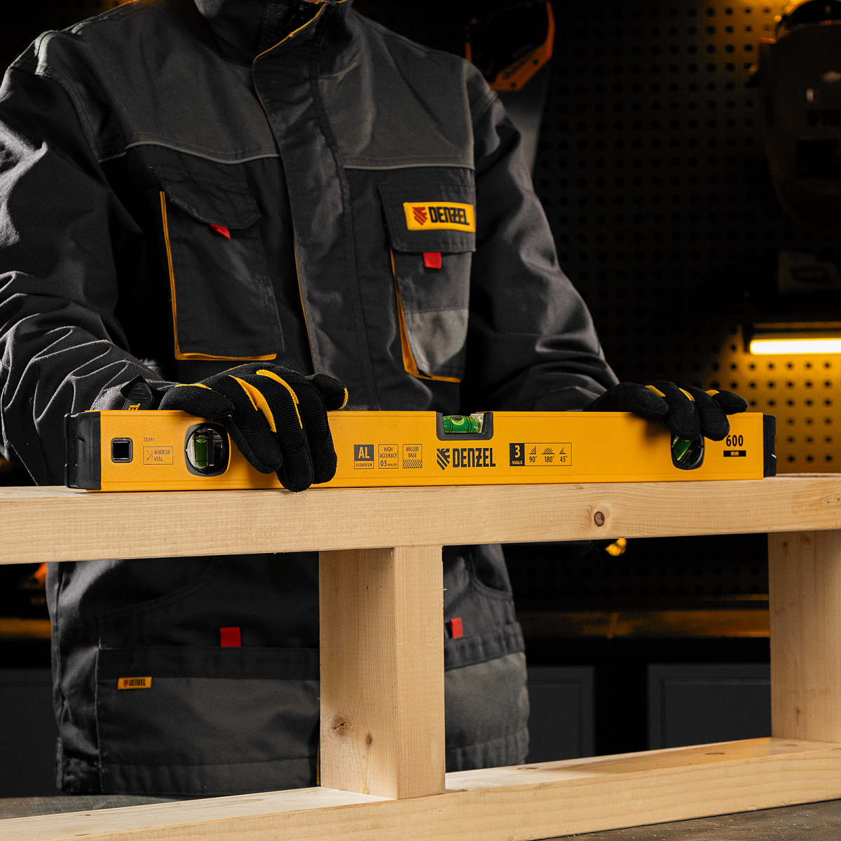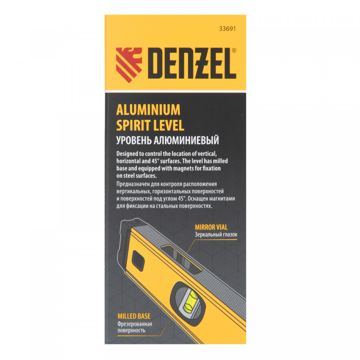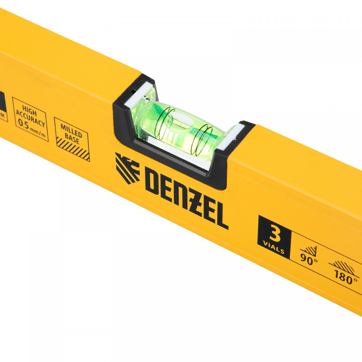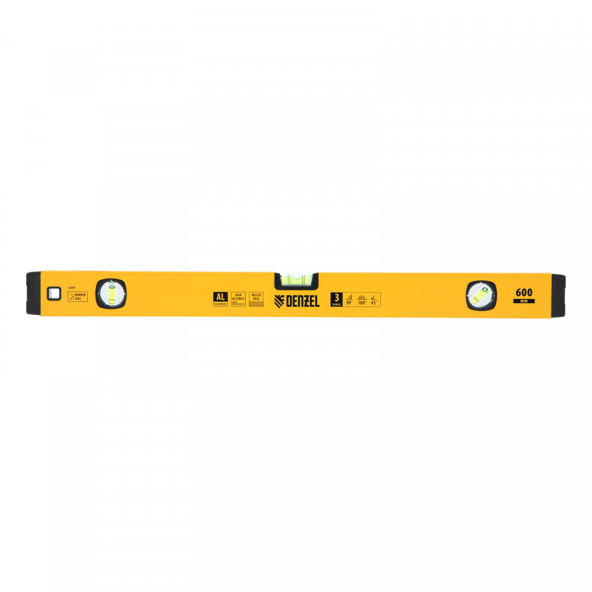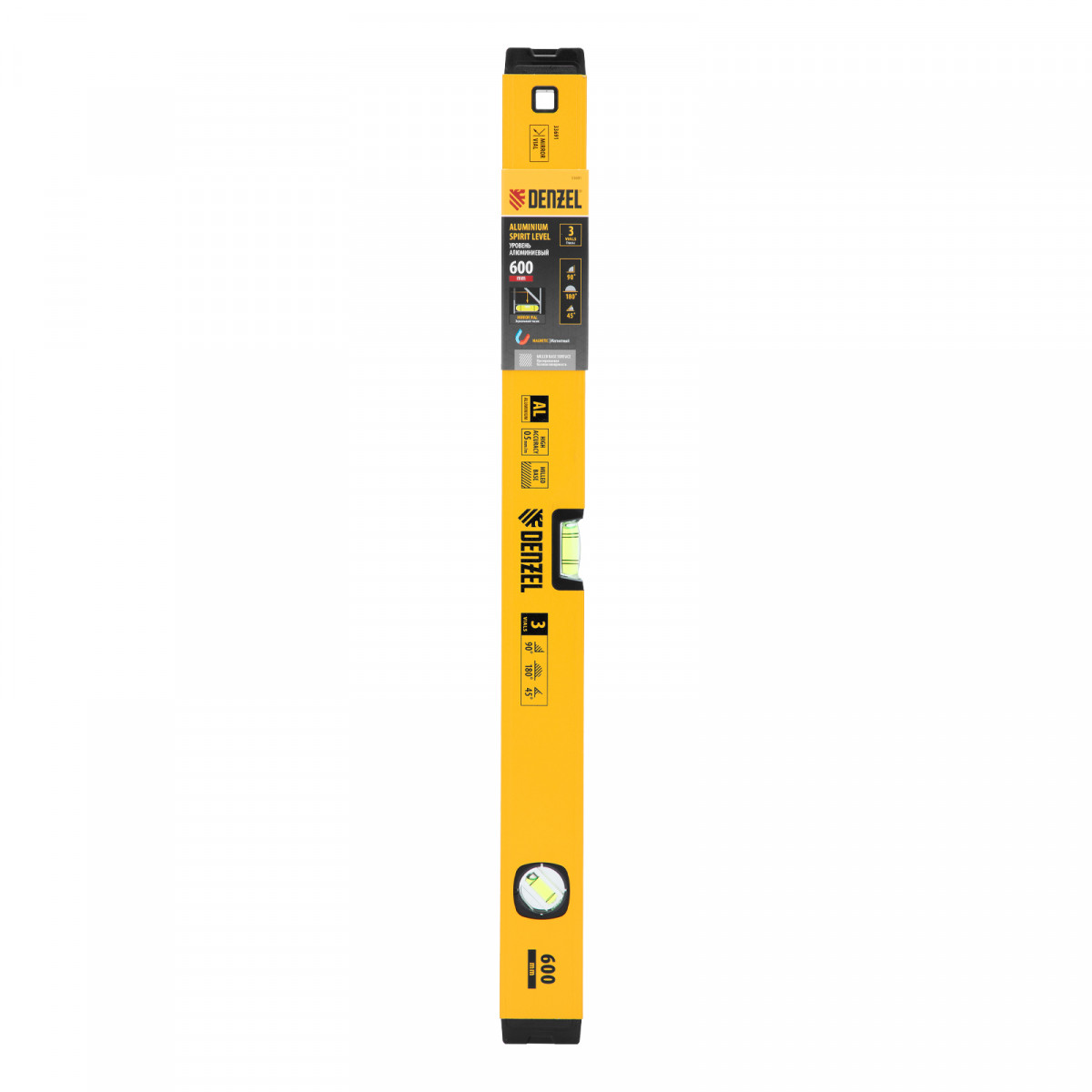 Уровень алюминиевый, магнит, фрезерованный, 3 глазка (1 зеркал.) 0,5 мм/м, 600 мм Denzel
