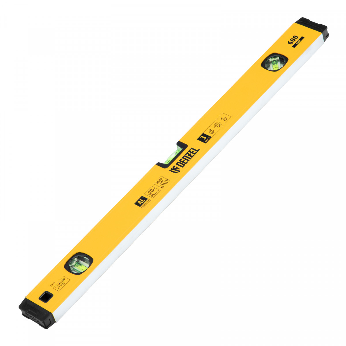 Алюминиевый фрезерованный уровень Denzel 33691 длиной 600 мм, с магнитом и 3 глазками, из которых 1 зеркальный, предназначен для контроля отклонений от горизонтальной, вертикальной и поверхности под углом 45° с точностью 0,5 мм/м. 3 пузырьковые камеры 90°, 180° и 45° позволяют быстро проверить правильность разметки. Инструмент незаменим при проведении строительных, ремонтных, сантехнических работ.