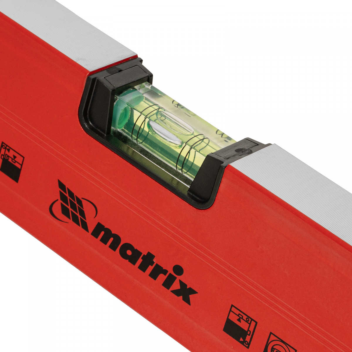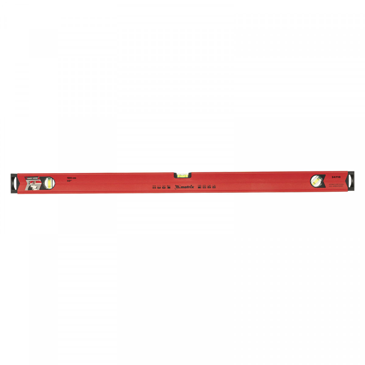 Уровень алюминиевый магнитный Matrix 34710 усиленной конструкции, длиной 1000 мм, с фрезерованной рабочей поверхностью, оснащен 3 глазками и одним зеркальным отражателем. Позволяет выявить отклонения от вертикали, горизонтали и угла 45°. Встроенный зеркальный глазок облегчает считывание показаний.