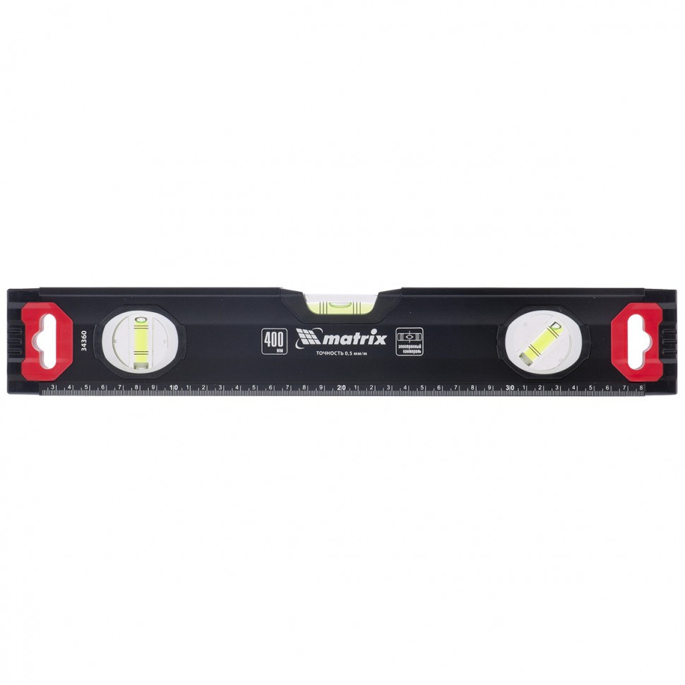 Уровень алюминиевый усиленный Matrix 34360 длиной 400 мм, фрезерованный, с 3 глазками, используется для проверки точности горизонтальных и вертикальных поверхностей и угла 45°. Инструмент повышает качество монтажных, отделочных и других работ, незаменим на строительной площадке.