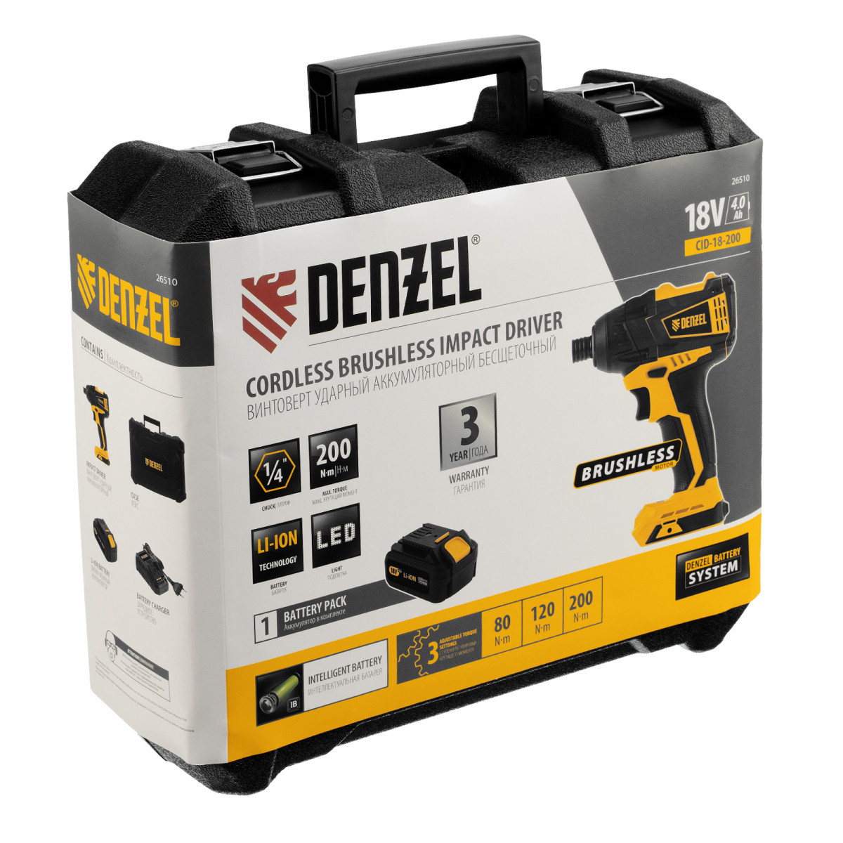Ударный аккумуляторный винтоверт Denzel CID-IB-200 26510 с бесщеточным двигателем работает от батареи Li-Ion с рабочим напряжением 18 В и предназначен для завинчивания и отвинчивания винтов и шурупов, а также затягивания и откручивания гаек. Эффективен для демонтажа перетянутого и закисшего крепежа, закручивания длинных болтов и шурупов. Пригодится для сборки мебели и различных конструкций.,Аккумуляторный винтоверт не зависит от стационарного источника энергии. Интеллектуальная батарея емкостью 4 А/ч с защитой от перезаряда и глубокого разряда не имеет эффекта памяти, благодаря чему обеспечивает стабильную работу инструмента на протяжении длительного времени.