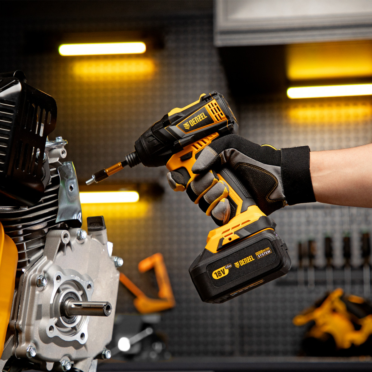 - Универсальность — к инструменту подойдут любые 18 В аккумуляторы Denzel battery system