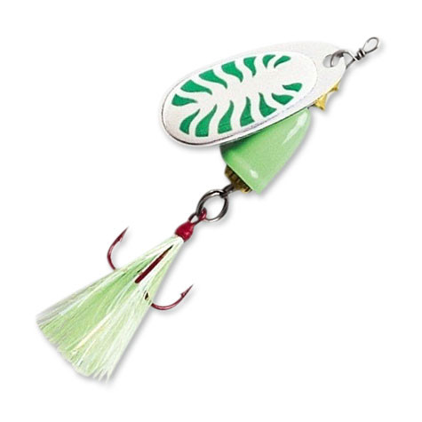 Blue Fox Vibrax Glow - вращающаяся блесна, состоящая из лепестка и средней части, выполняющей дополнительно функцию колокольчика. Особенность этой модели "вертушки" в наличии хвостовом оперения. В остальном же, она очень похожа на всю серию подобных приманок от Blue Fox. А именно, нержавеющие материалы, яркая окраска, голографическая поверхность, прекрасно отражающая свет. Кроме этого блесна имеет шумовую камеру, острые негнущиеся тройники от VMC, конструкцию, предотвращающую перекручивание лески. Рабочая глубина приманки от 0,6 до 1,2 метров, а угол вращения лепестка 45 градусов. Вес: 6гр