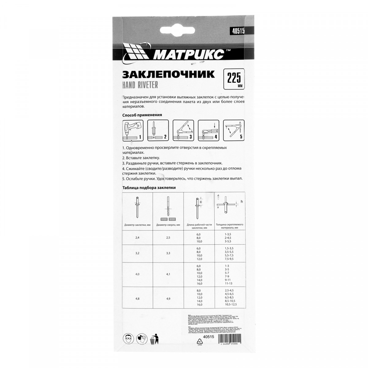 Заклепочник МАТРИКС 40515 длиной 225 мм используется с вытяжными заклепками диаметром от 2,4 до 4,8 мм. Инструмент применяется при работе с многослойным материалом и различными деталями из металла, пластика и т. д. В комплект входят сменные насадки для заклепок различного диаметра, фиксирующиеся на корпусе инструмента, поэтому их можно быстро менять при необходимости. Заклепочник будет полезен во время проведения строительных и ремонтных работ, пригодится также дома, в гараже или на даче., ,Преимущества,Прочность и долговечность — корпус выполнен из конструкционной стали.,Быстрая установка нужной насадки — в комплект поставки входит монтажный ключ.,Комфортная работа — рукоятки с рельефной поверхностью не выскальзывают из руки.,Удобное хранение — металлическая скоба надежно фиксирует рукоятки в нерабочем состоянии.