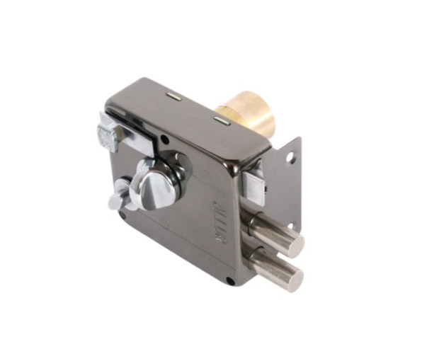 Замок накладной цилиндровый с вертушкой, фиксатором и защелкой. Предназначен для установки на деревянные двери. Засов из двух цилиндрических ригелей диаметром 12 мм, с максимальным вылетом 22 мм. Удаление ключевого отверстия - 50 мм. Габариты замка - 86х77х25 мм. Комплектация - 5 ключей, запорная планка, накладка. Механизм замка под англ.ключ, идет совместно с корпусом. Закрывание и открывание замка изнутри производится вертушкой, снаружи ключом.