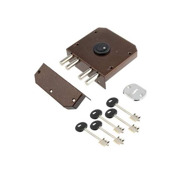 Замок накладной сувальдный. Предназначен для установки на металлические двери правого и левого открывания. Засов из четырех цилиндрических ригелей диаметром 14 мм, с максимальным вылетом 40 мм. Удаление ключевого отверстия - 64 мм. Количество полуоборотов ключа - 4. Габариты замка - 137х150х22 мм. Комплектация - 5 ключей, запорная коробка, накладка на ключевое отверстие.