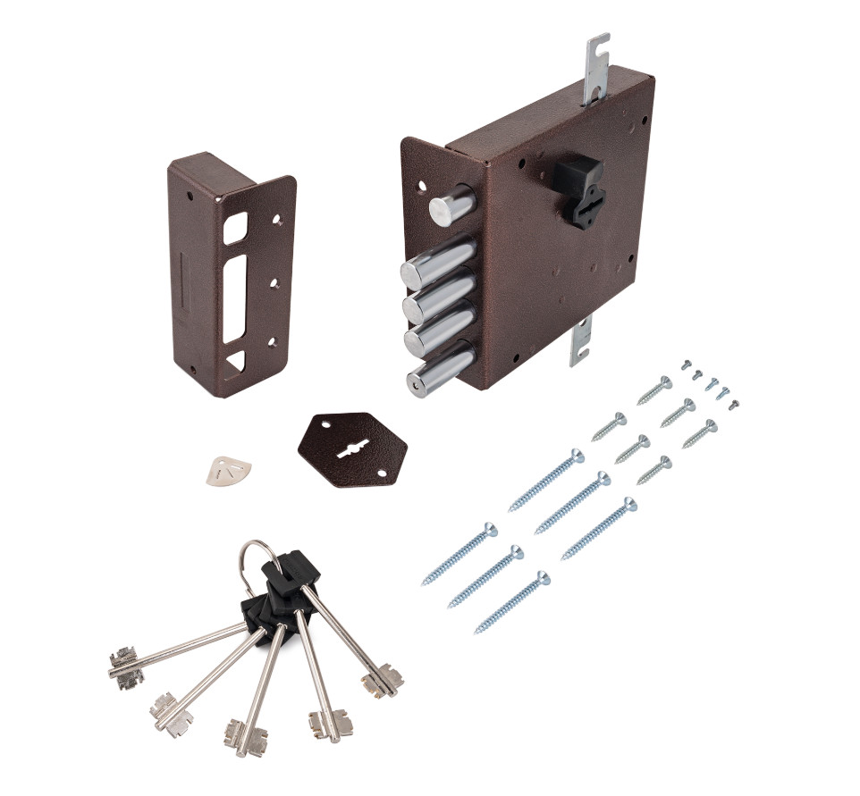 Предназначен для установки на металлические двери. Замок имеет возможность подключения тяг и рекомендуется для установки в металлические двери подъездов, гаражей, ангаров и других помещений. Все детали замка выполнены из высокопрочной стали. Защита от высверливания механизма, от взлома свертышем, от перепиливания засова, от вскрытия отмычкой и самоимпрессии.Тип замка - накладной.Модель замка - универсальный.Тип механизма секретности - сувальдный.Количество комбинаций - 250 000.Задвижка - есть.Тяги - есть.Количество штырей - 4.Длина ключа - 102 мм.Материал ключа - латунный с пластиковой головой.Количество ключей - 5.Вылет ригелей - 42 мм.Диаметр ригелей - 15.7 мм.Бэксет - 83 мм.Размеры - 157х144,8х31 мм.