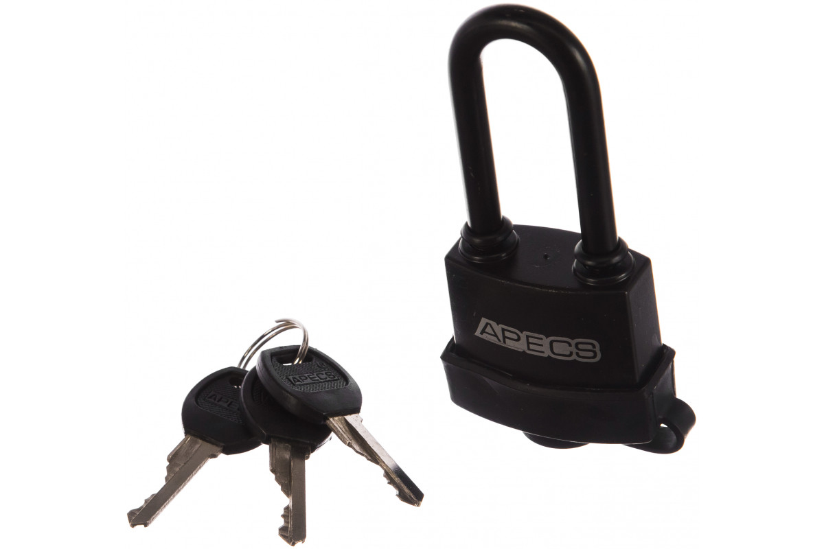 Висячий замок APECS PDR-50-45-L  - всепогодное изделие с удлиненной дужкой. Все детали замка защищены  от воздействия коррозии: корпус в резиновом чехле, дужка одета в силиконово-пластиковый несъёмный кожух, отверстие для ключа закрывается резиновой заглушкой. Латунный цилиндровый механизм обеспечит долгосрочную бесперебойную работу замку.